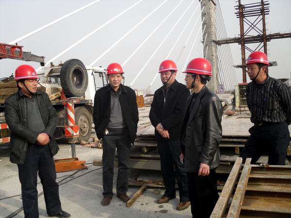 在大橋主跨施工現(xiàn)場,項(xiàng)目經(jīng)理江仲明向戴總一行詳細(xì)匯報(bào)了工程質(zhì)量、進(jìn)度、安全控制情況。戴總對我部當(dāng)前的工程進(jìn)展情況表示滿意,希望我部再接再厲,特別是在工程收尾階段不能松懈,要一如既往的做好各項(xiàng)工作,繼續(xù)加強(qiáng)文明施工,扎實(shí)推進(jìn)項(xiàng)目精細(xì)化管理。