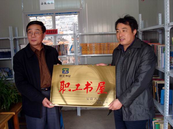 劉主席首先來到項(xiàng)目部職工書屋,察看了書屋的軟硬件設(shè)施及借閱情況,并聽取了項(xiàng)目經(jīng)理江仲明關(guān)于項(xiàng)目施工及職工書屋創(chuàng)建情況的匯報(bào)。劉主席對書屋的建設(shè)和管理予以了肯定和贊許,并對書屋更好的發(fā)展提出了希望和要求:一、立足實(shí)際、講求實(shí)效;二、營造氛圍,大力宣傳;三、實(shí)現(xiàn)資源共享,發(fā)揮最大效益;四、總結(jié)經(jīng)驗(yàn)、持續(xù)發(fā)展。邢應(yīng)梅書記還饒有興趣地翻看了圖書借閱登記表,了解職工借閱圖書情況,并對進(jìn)一步完善職工書屋的建設(shè)提出了幾點(diǎn)建議。隨后舉行了簡短的授牌儀式,劉主席向項(xiàng)目經(jīng)理江仲明轉(zhuǎn)授了由安徽省總工會頒發(fā)的“職工書屋”牌匾,并代表集團(tuán)工會向職工書屋贈送了各類書籍300余冊。