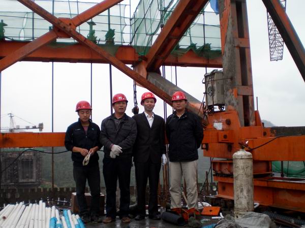31日上午,在經(jīng)過整夜大雨后,天空依舊飄散著涼涼的細(xì)雨。盛總一行在項(xiàng)目總工胡學(xué)祥和項(xiàng)目副經(jīng)理張林的陪同下,對(duì)巖子腳大橋進(jìn)行了認(rèn)真的檢查,并冒雨登上高達(dá)74米的4號(hào)主墩施工現(xiàn)場。他就進(jìn)行到掛藍(lán)施工階段的大橋與項(xiàng)目人員展開討論,對(duì)施工現(xiàn)場存在的施工難點(diǎn)和注意事項(xiàng)一一指出。盛總對(duì)項(xiàng)目部克服種種困難加緊施工作出了肯定。