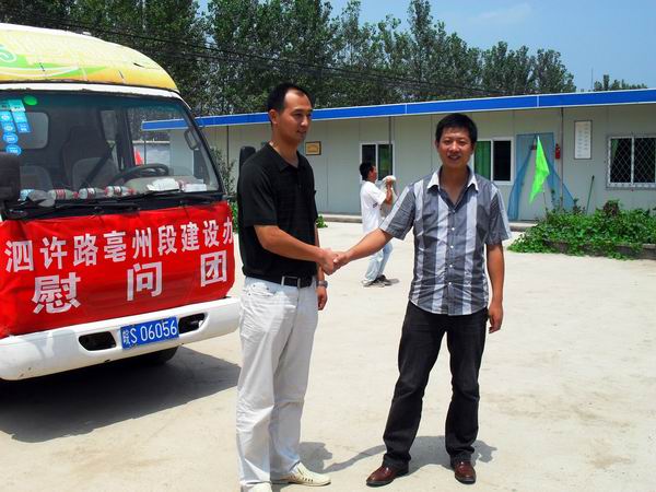 安徽交投集團泗許高速亳州段建設(shè)辦到泗許01標慰問 發(fā)布時間:2009年07月29日 來源:泗許01標 發(fā)布人: 作者:章玉潔 瀏覽:5436次 連日來,持續(xù)高溫,7月24日上午,交投集團泗許高速亳州段建設(shè)辦綜合部部長王文飛一行帶著綠豆等防暑慰問品,冒著烈日來到泗許項目01標進行慰問,讓我標段的所有員工在高溫一線倍感清涼。