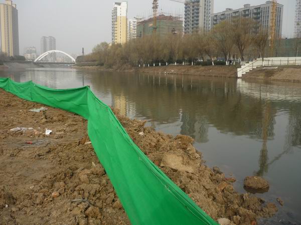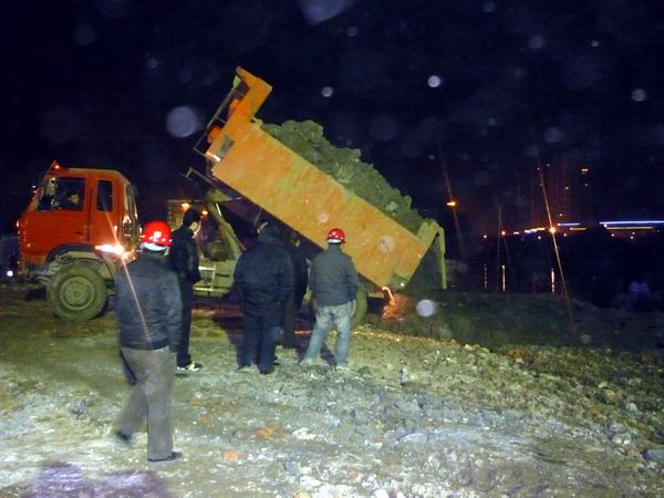 當(dāng)12月19日,宋斗灣路完成第一根樁(位于南淝河北側(cè),屬于3#橋臺)的開挖澆注工作后,項(xiàng)目經(jīng)理部就開始籌劃南淝河南側(cè)的筑島圍堰工作。12月24日,當(dāng)3#橋臺的六根樁全部澆注完成后,當(dāng)天晚上仍繼續(xù)前一晚的筑島工作。每次筑島時,現(xiàn)場橋梁技術(shù)員、測量技術(shù)員和安全員都和工人們一起奮戰(zhàn),而每次奮戰(zhàn)都是一個通宵。截至25日,南淝河筑島圍堰共計用土近270車,約4600方,筑島面積和筑島深度達(dá)到預(yù)案和監(jiān)理要求,符合現(xiàn)場施工的實(shí)際要求。至此,筑島圍堰工作圓滿完成。