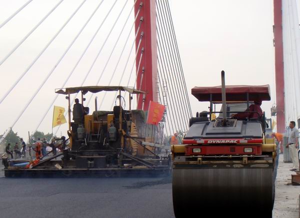 為了提高大橋橋面瀝青鋪裝質(zhì)量,在攤鋪前項目部組織200余名工人突擊清理橋面表面浮漿,待沖刷干凈并涂上防水層后,開始攤鋪瀝青。在攤鋪過程中全部使用自動攤鋪機和重型壓路機,使攤鋪、碾壓等工序科學(xué)合理、規(guī)范達標。攤鋪施工剛一結(jié)束,黑亮寬敞而又整潔順暢的橋面就引來周邊過往市民的嘖嘖稱贊。