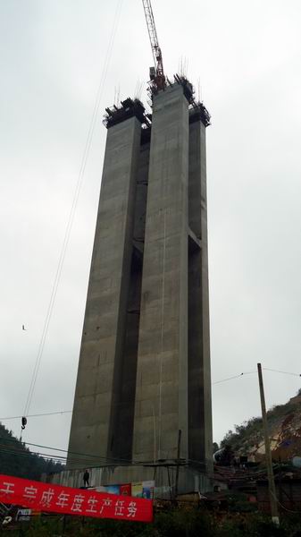 巖子腳特大橋為連續(xù)性剛構橋,兩主墩之間跨度160米。主橋左、右幅均為混凝土連續(xù)箱梁,是水盤線幾個重點控制工程之一,也是影響我項目工期的關鍵性工程。該橋主體橋墩都有4根墩柱,高度均超過58米,此次完成封頂?shù)闹鳂?SPAN lang=EN-US>4號墩是迄今為止我公司施工過的最高橋墩。