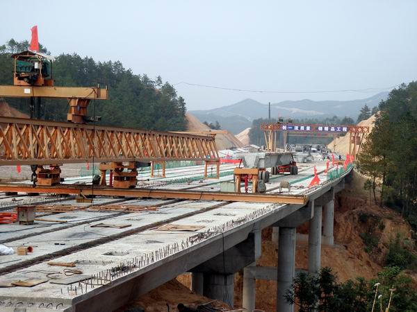 站塘高架橋位于會(huì)昌縣站塘鄉(xiāng),中心樁號(hào)問(wèn)為K1498+450。大橋全長(zhǎng)135米,共5跨,上部結(jié)構(gòu)為連續(xù)預(yù)應(yīng)力箱梁。10月5日,站塘大橋開(kāi)始架設(shè)第一片箱梁,經(jīng)過(guò)一個(gè)多月的努力施工,終于全幅貫通。