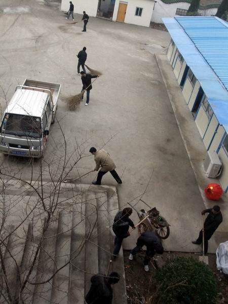 同志們各持工具,有說有笑,一時(shí)間項(xiàng)目部呈現(xiàn)出一派熱火朝天的景象。經(jīng)過將近3個(gè)小時(shí)的清理,項(xiàng)目部樓道、廁所、花壇、廣場都煥然一新。
