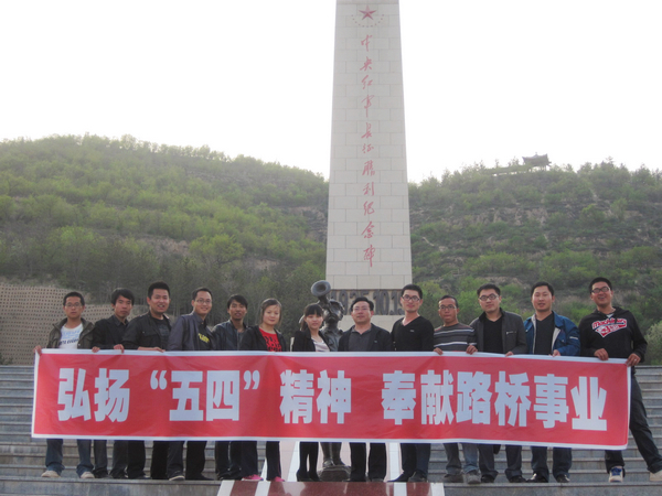 為不影響施工生產(chǎn),活動選擇在下午6點進行。項目經(jīng)理帶領(lǐng)全體青年團員前往吳起縣中央紅軍與陜北紅軍會師地吳起縣中央紅軍革命紀念園,接受紅色教育。項目部全體青年團員順著革命先輩踏過的臺梯,一步步的登上中央紅軍長征勝利紀念碑的腳下,共同拉著“弘揚五四精神奉獻路橋事業(yè)”的宣傳標語進行合影留念。