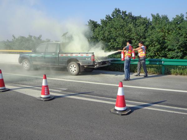 16:40,隨著蕪宣高速公路管理公司副總經(jīng)理郭建華的一聲令下,蕪宣養(yǎng)護(hù)項(xiàng)目組織開展的突發(fā)交通事故處置聯(lián)合演練開始。16時(shí)45分,事故車輛撞向錐標(biāo),沖入封閉區(qū)并撞壞護(hù)欄。16:46,巡標(biāo)員發(fā)現(xiàn)事故,立刻補(bǔ)齊被撞倒錐標(biāo),并向項(xiàng)目安全環(huán)保部負(fù)責(zé)人報(bào)告;同時(shí)安排其他巡標(biāo)員到事故車輛后方搖旗警示。16:48,項(xiàng)目安全環(huán)保部負(fù)責(zé)人李剛就事故情況報(bào)告監(jiān)控中心,并向項(xiàng)目應(yīng)急救援小組組長(zhǎng)曹祝林匯報(bào)事故情況。16:54,蕪湖市高速交警一大隊(duì)巡警及施救組趕到事故現(xiàn)場(chǎng),組織對(duì)駕駛員進(jìn)行營(yíng)救。16:55,施救組成員對(duì)受傷駕駛員傷口進(jìn)行消毒、包扎。16:57,事故車輛起火。16:58,項(xiàng)目應(yīng)急救援小組成員對(duì)事故車輛進(jìn)行滅火。17:02,路政部門到達(dá)現(xiàn)場(chǎng),對(duì)事故車輛進(jìn)行勘察,并向陪乘人員了解事故情況及駕駛員情況。17:11,對(duì)蕪宣方向車輛進(jìn)行管制。17:34,清障車在未知情情況下進(jìn)入事故現(xiàn)場(chǎng),對(duì)事故車輛進(jìn)行施救。17:39,蕪宣方向交通開放,在交警、路政、項(xiàng)目巡標(biāo)員的指揮下緩慢行走。17:41,清掃組對(duì)事故現(xiàn)場(chǎng)的拋灑物、撞壞的錐標(biāo)等進(jìn)行清掃。17:45,交通恢復(fù)正常,郭建華總指揮宣布演練結(jié)束。