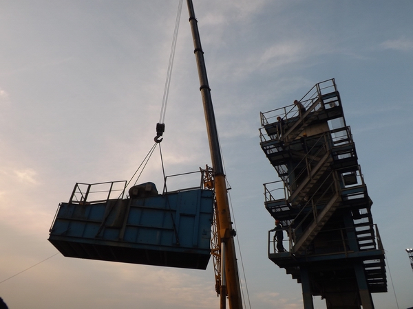 G205改建路面項(xiàng)目完成拌和站主樓吊裝 發(fā)布時(shí)間:2013年07月19日 來(lái)源:G205改建路面項(xiàng)目 發(fā)布人: 作者:楊艷峰 瀏覽:2819次 7月17日下午3時(shí),伴隨著響聲震天的鞭炮聲,兩輛大型吊車在安全技術(shù)人員和作業(yè)人員的通力協(xié)作下,安全有序地進(jìn)行拌和站主樓的吊裝。經(jīng)過(guò)全體施工人員的努力,于當(dāng)日下午6時(shí)30分完成拌和站主樓的吊裝。